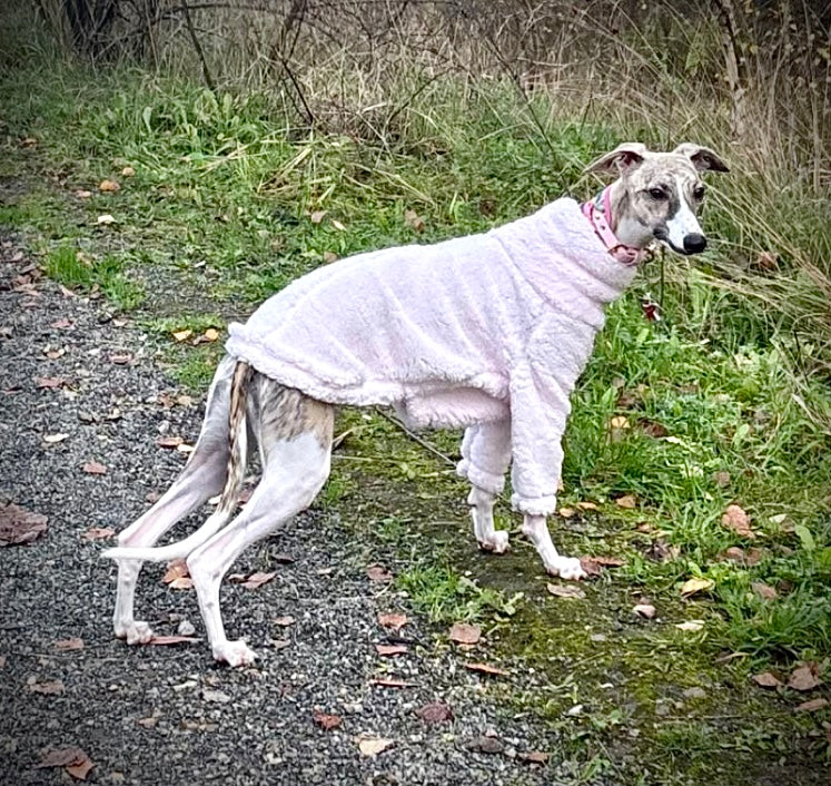 Made from ultra-soft, plush cuddle fur, the suit mimics the feel of a gentle hug, perfect for those cooler days. The design features a streamlined, tailored fit that conforms to the elegant body shape of these breeds, with a stretchy, breathable fabric that allows for easy movement.