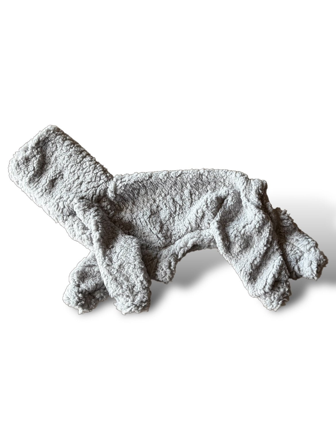 Our IggySuitsLondon 'Cuddle Fur Fleece' Iggy Suit in light grey all over.