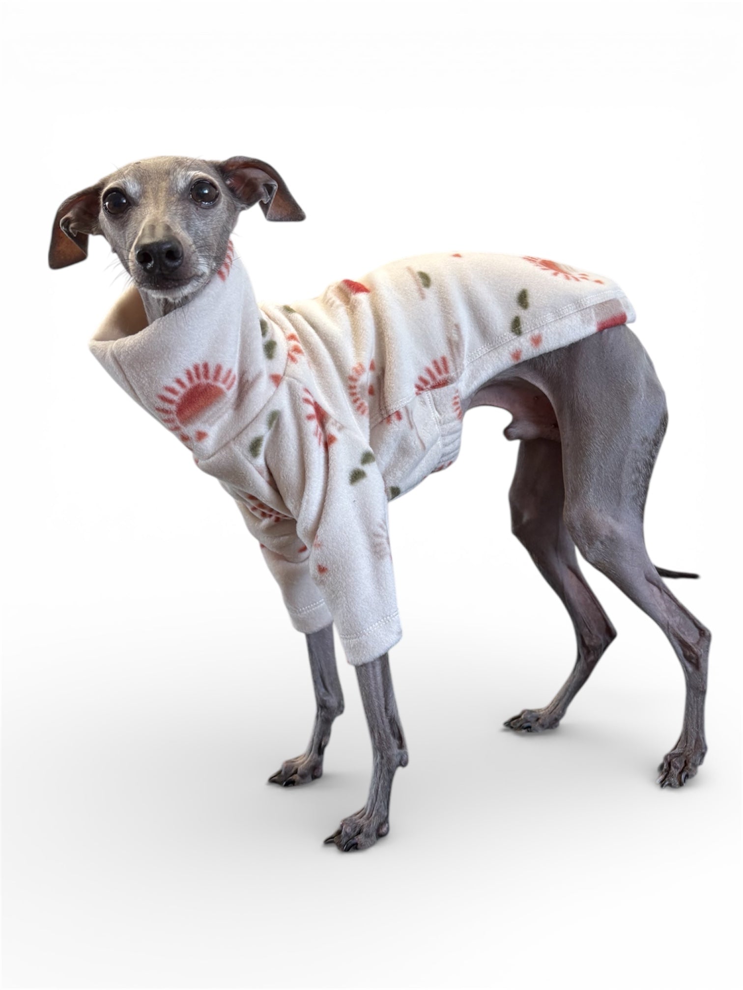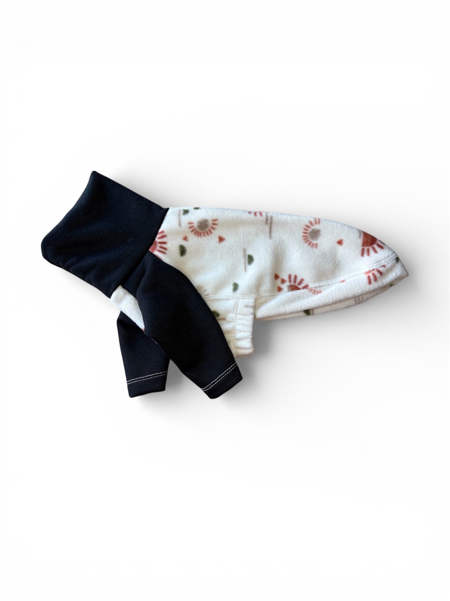 This cosy fleece jumper is designed for a comfortable fit to keep your dog warm during chilly days. A mixture of our 'Boho Sun Rise' fleece and a black sweatshirt to create a stylish cut.