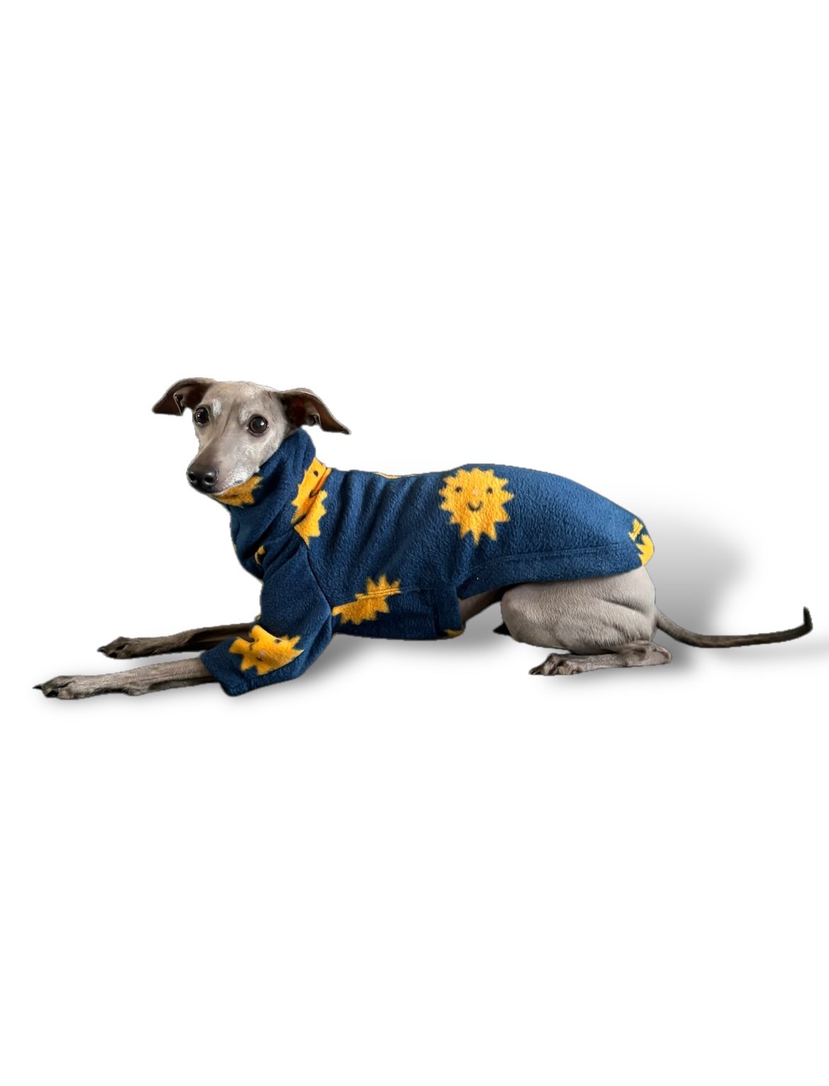 Our IggySuitsLondon sunny fleece jumper with 2 legs. Now, where else would you find such cute fabrics for your hound?!