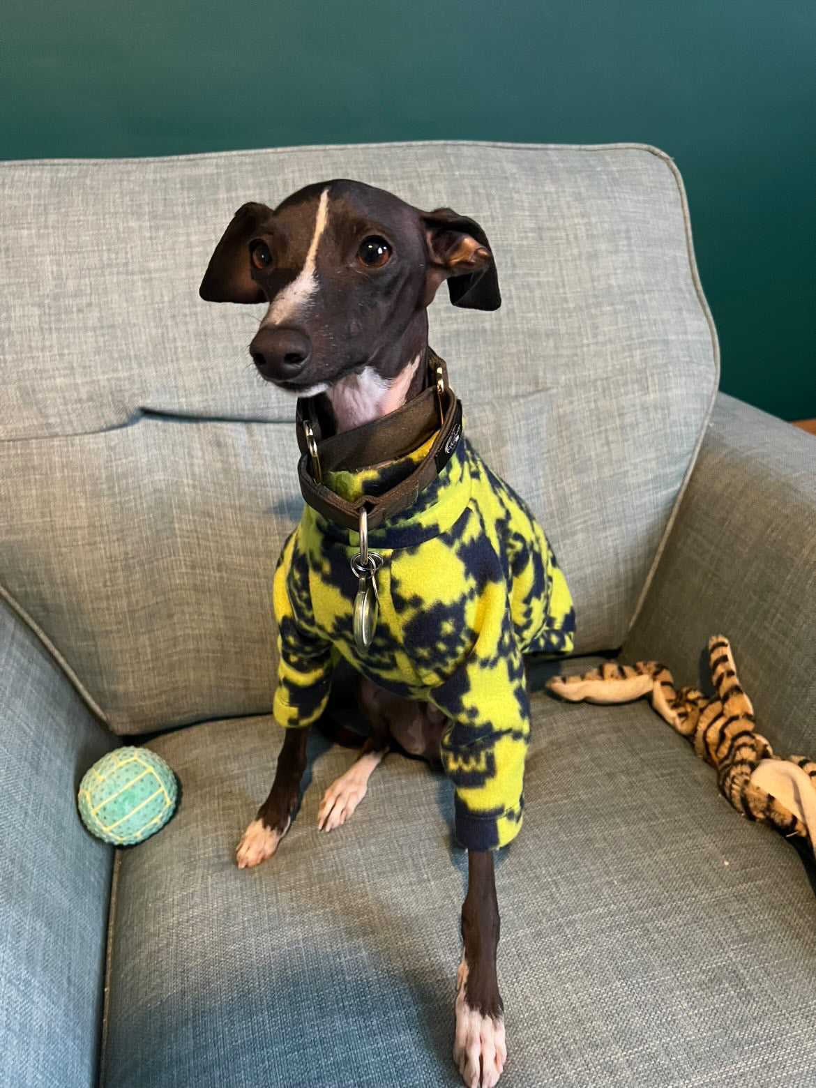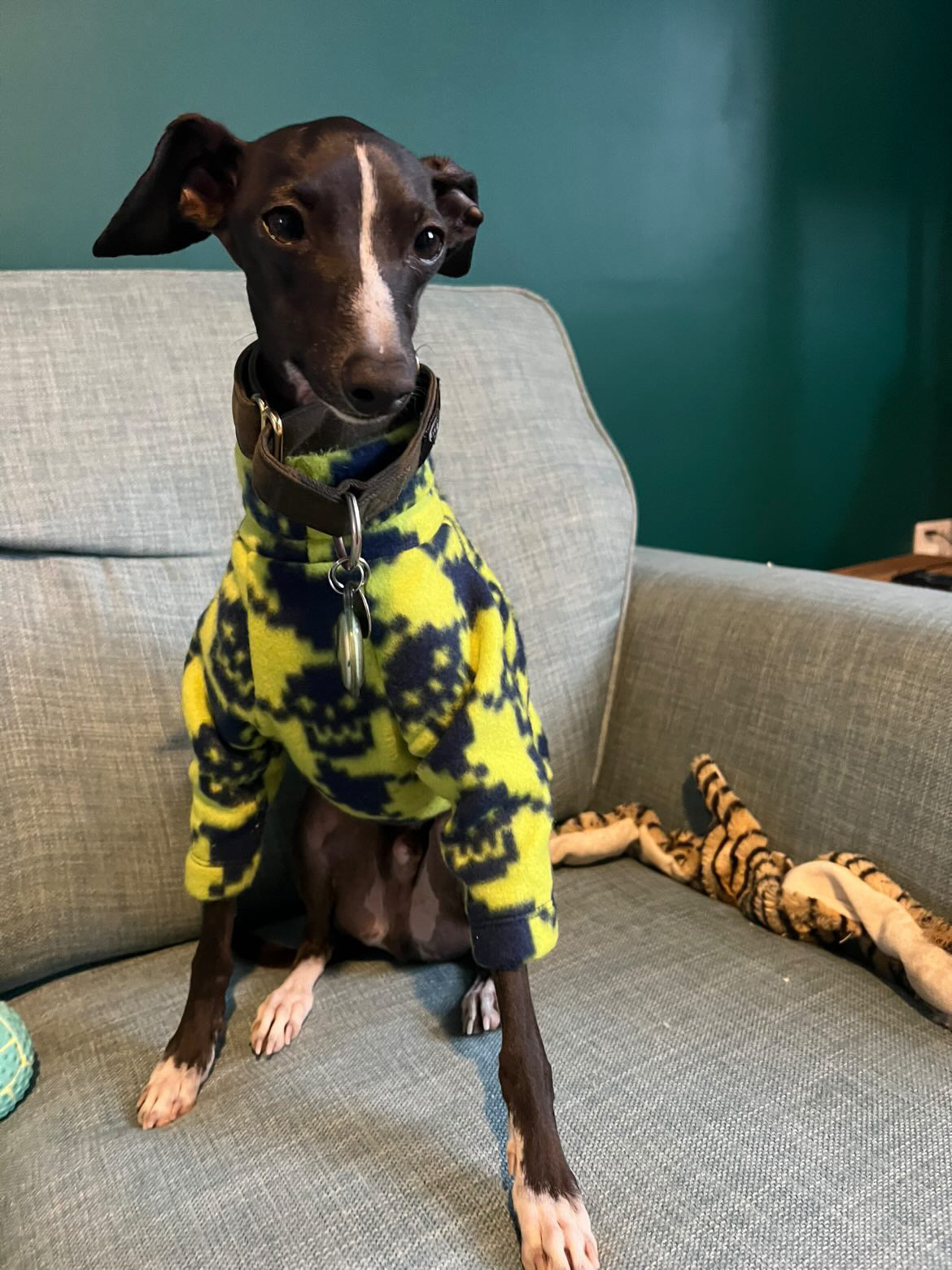 Our IggySuitsLondon neon skulls fleece jumper with 2 legs. Now, where else would you find such great alternative fabrics for your hound?!