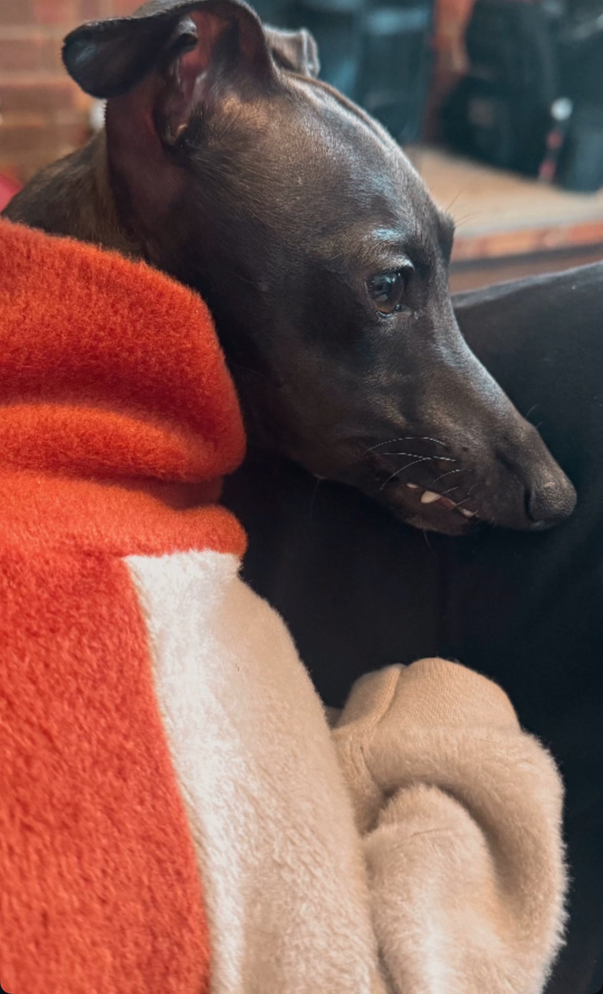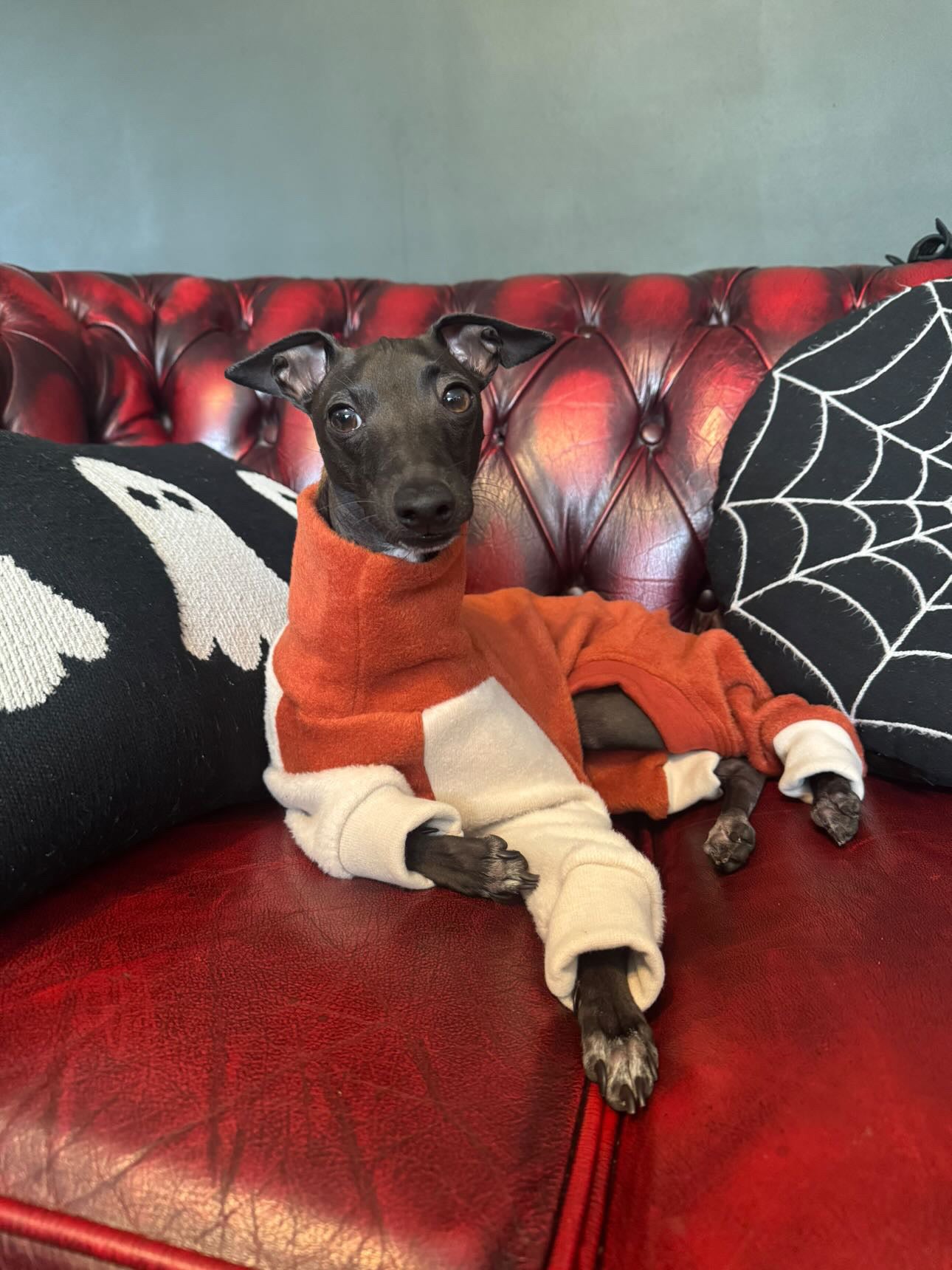 Our IggySuitsLondon fleece lined sweatshirt suit in rust with stone accents with 4 legs.