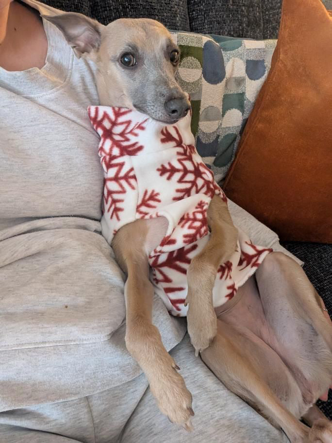 Sleeveless polar fleece vest in festive red snowflakes.