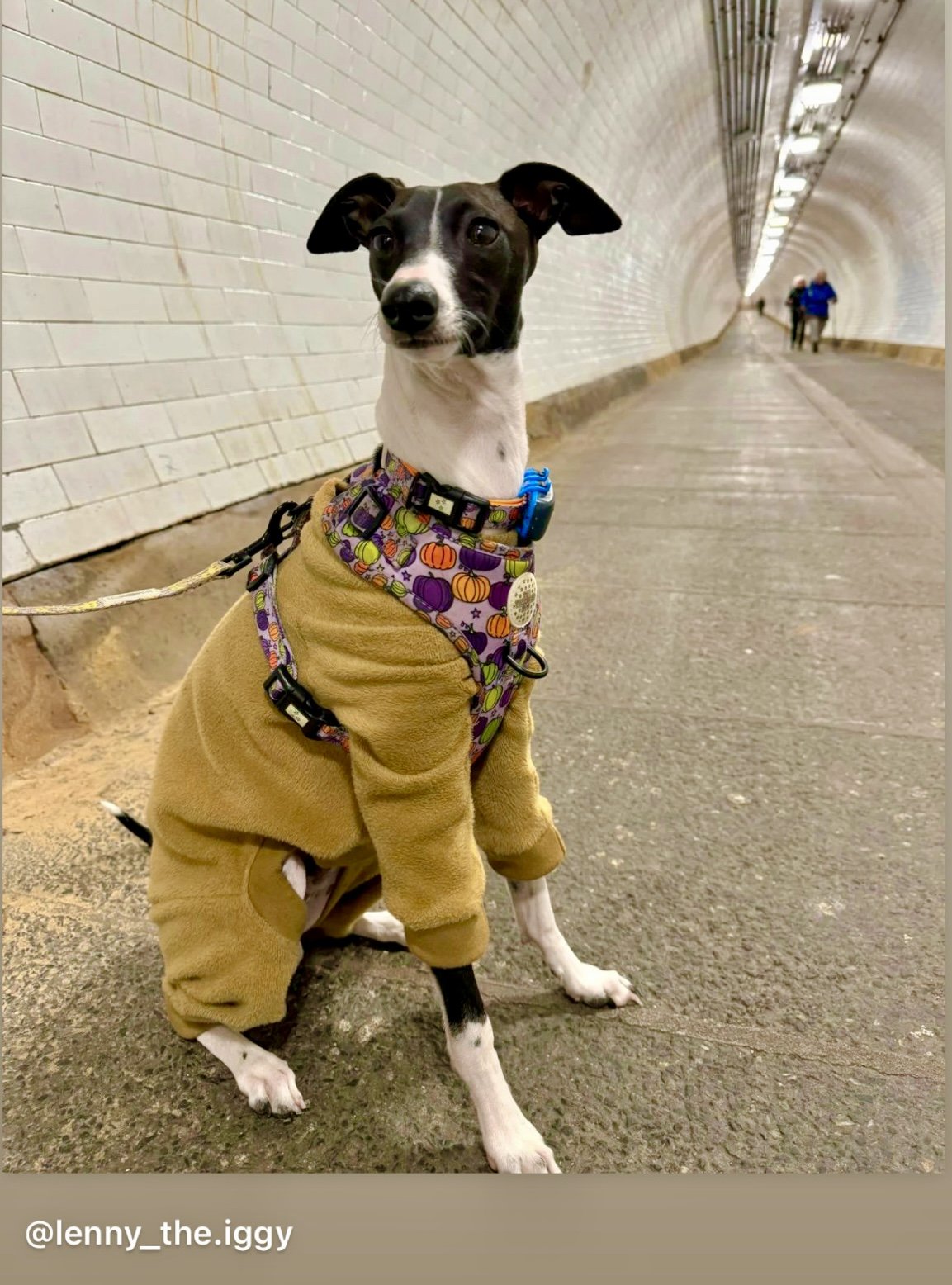 Our IggySuitsLondon fleece lined sweatshirt suit in Honey Yellow with 4 legs.