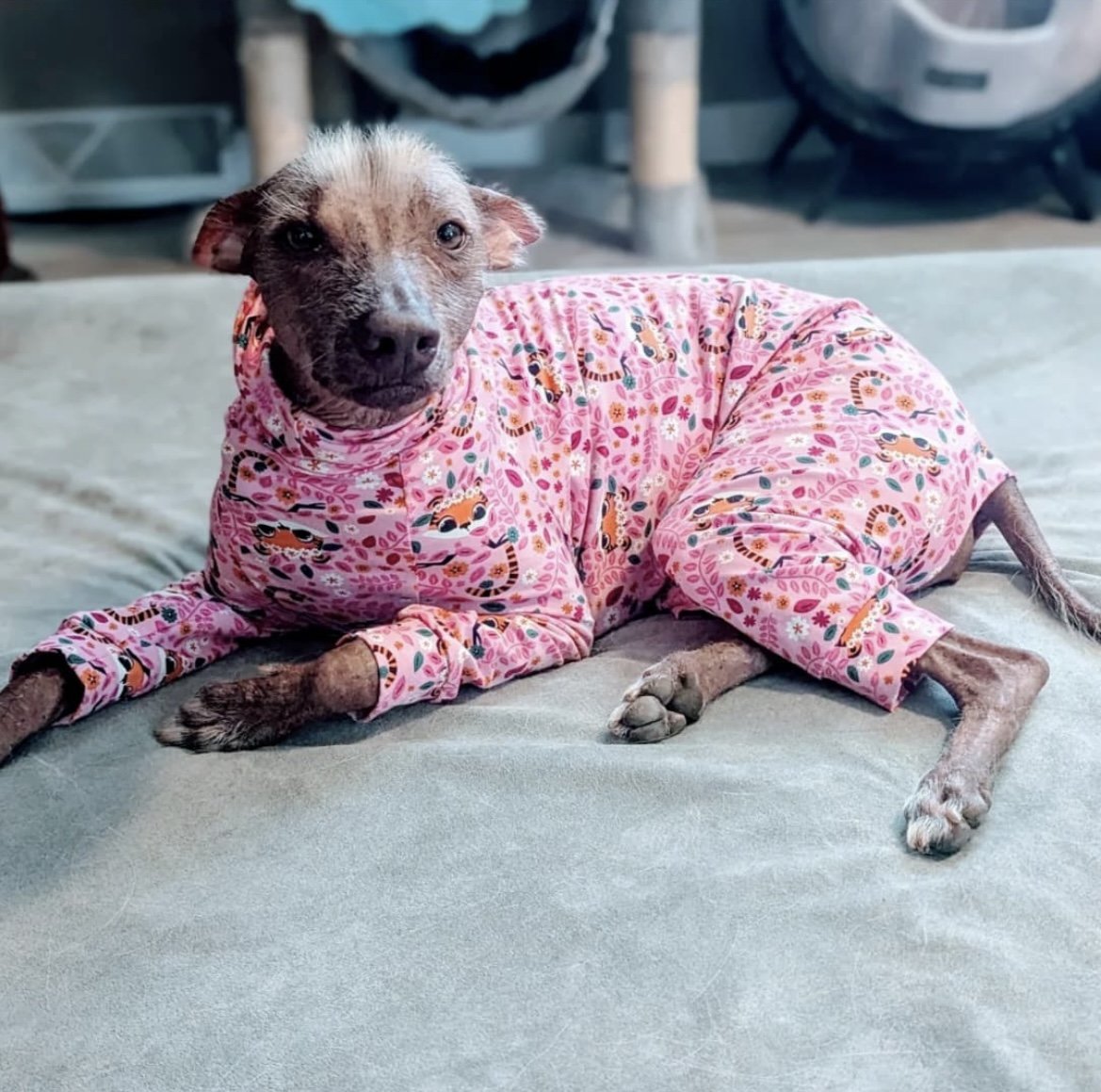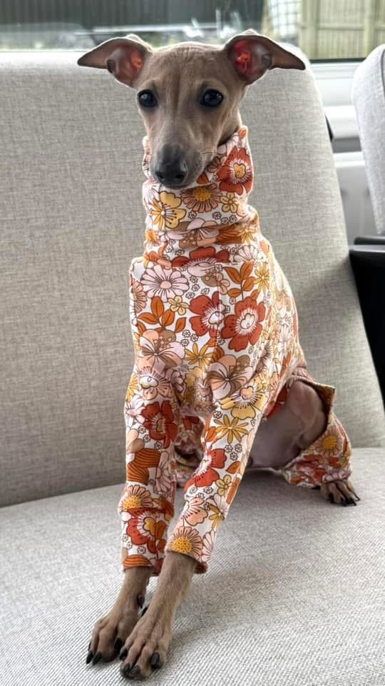 This cotton jersey fabric is so fun, I couldn't resist turning it into little suits for your dogs to run about in.