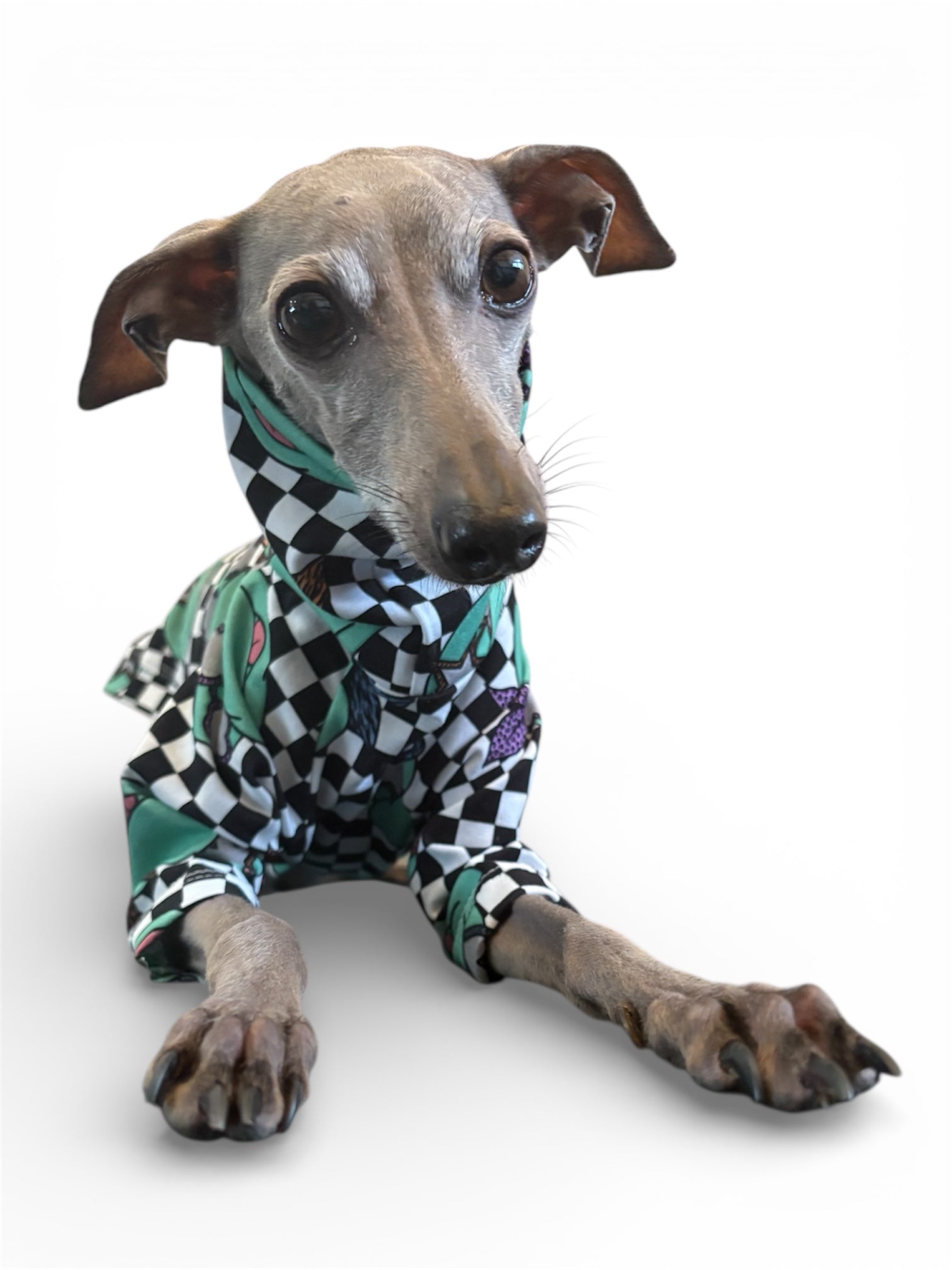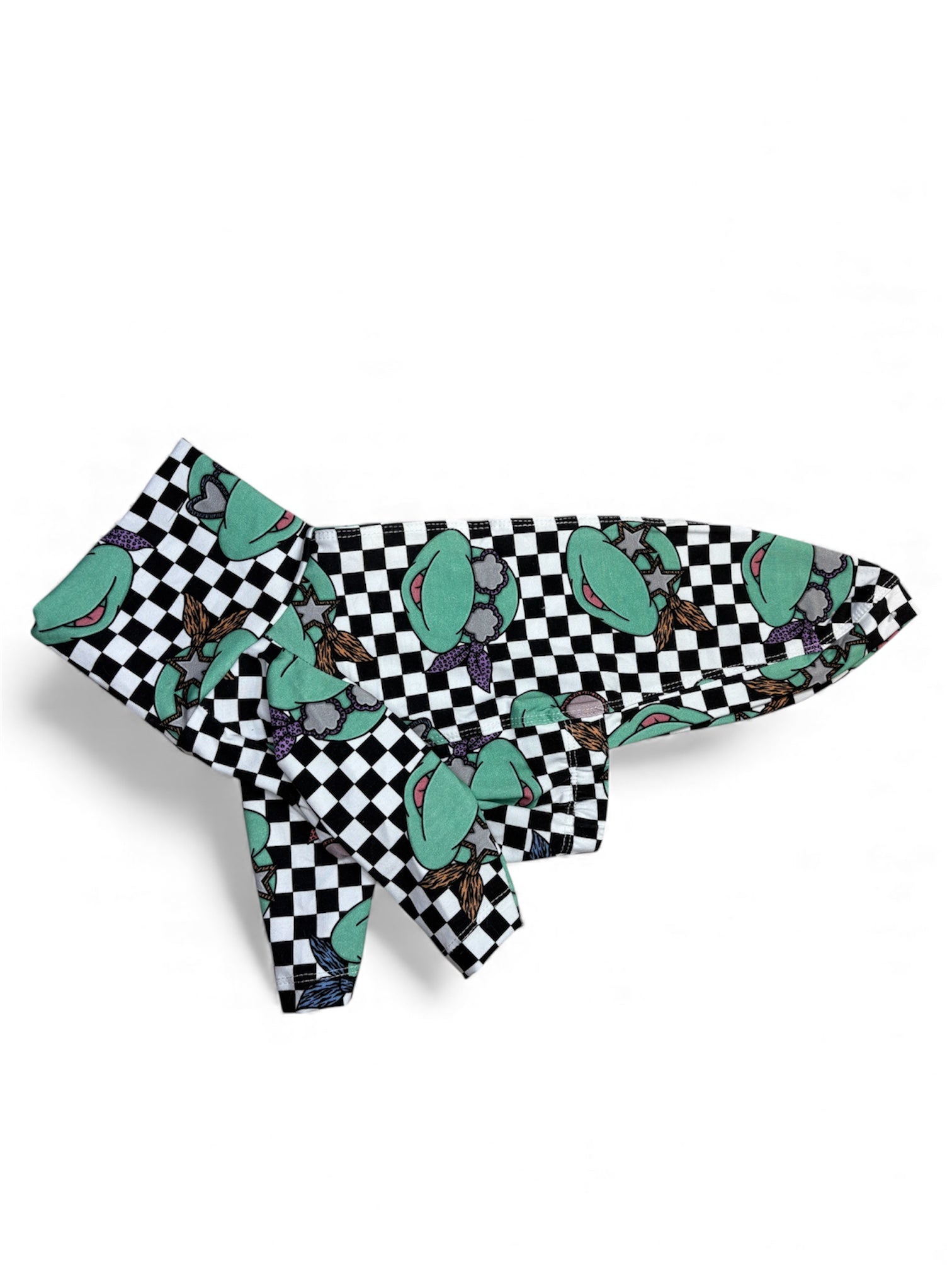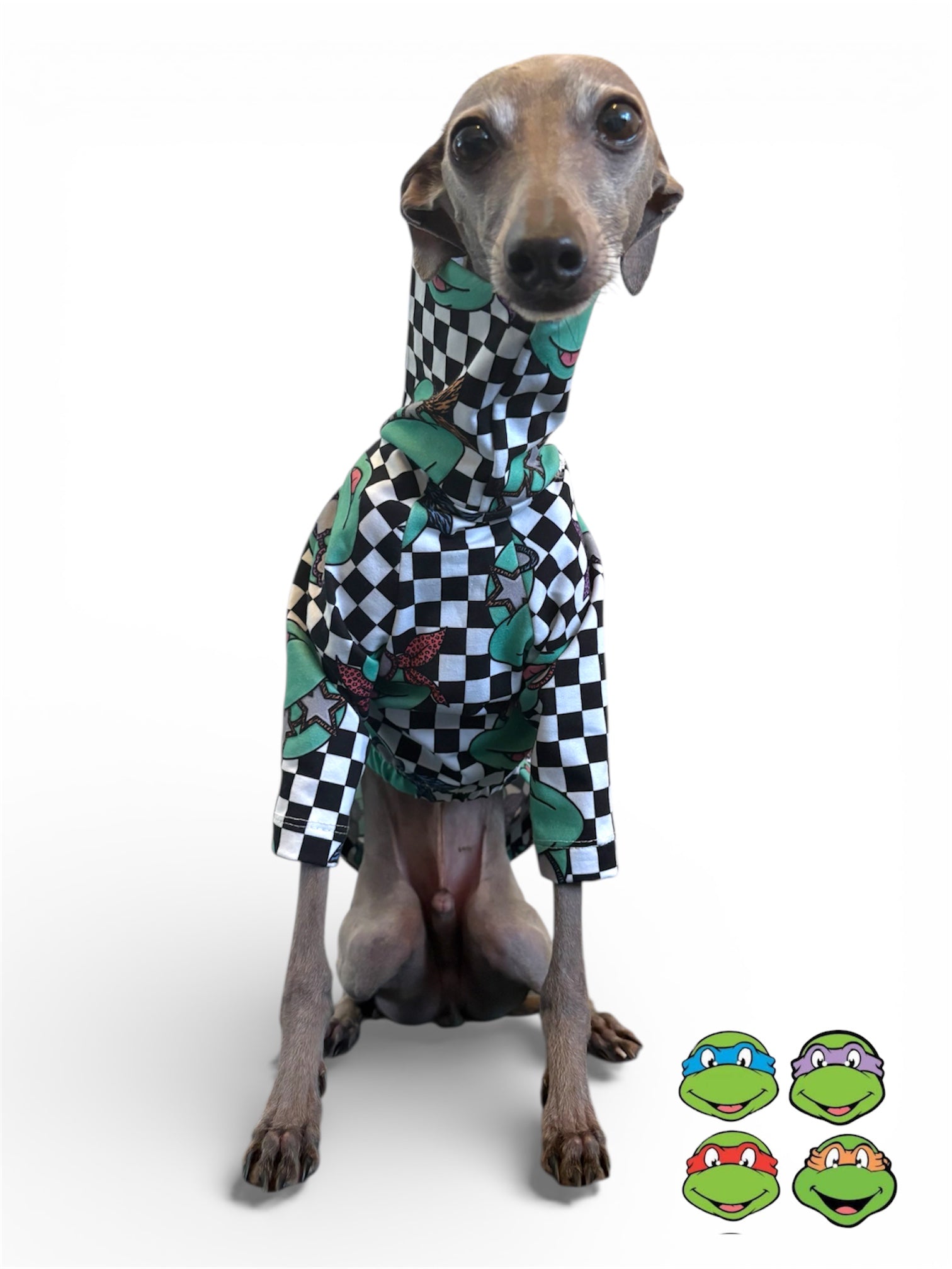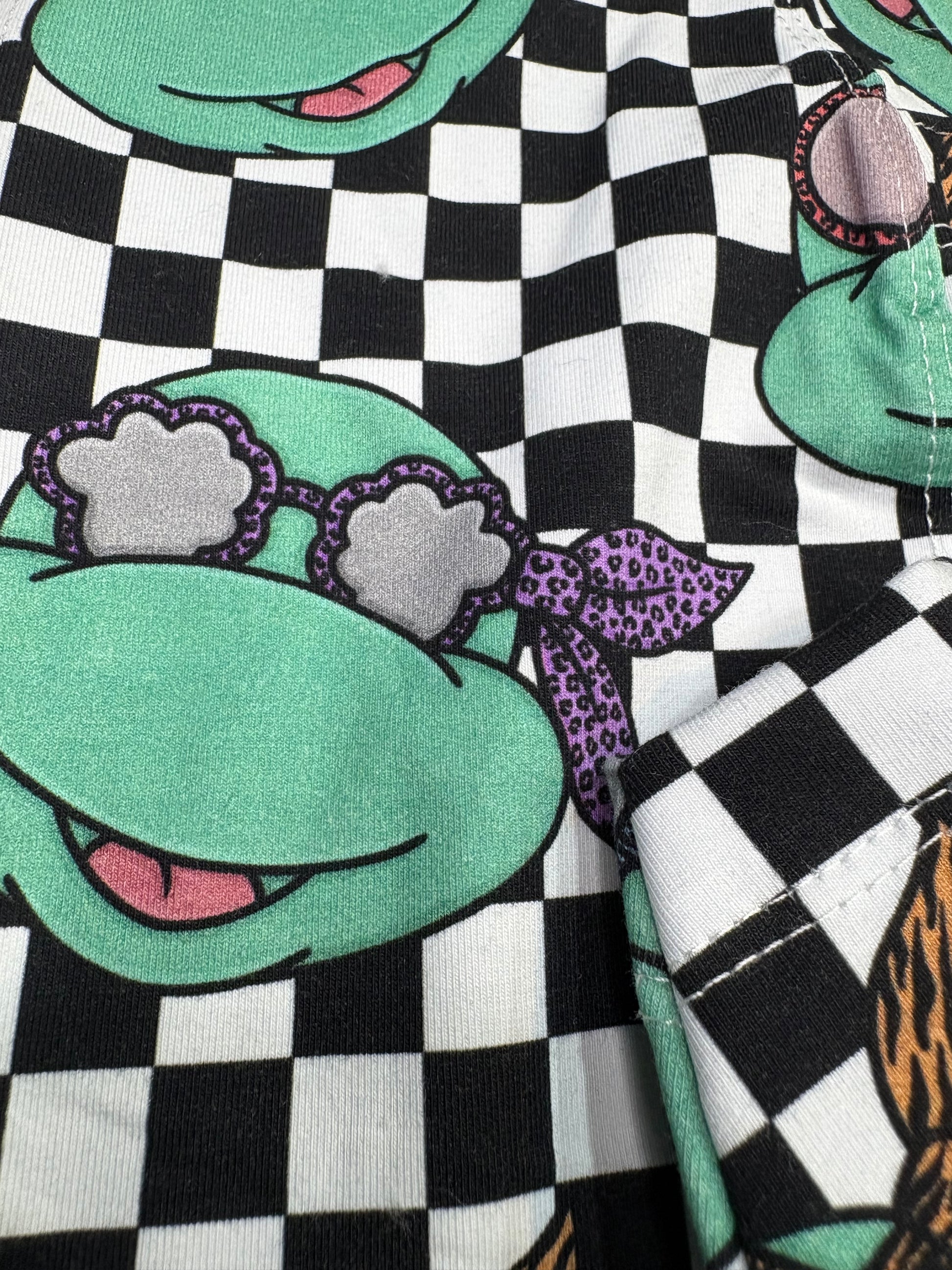 Our Iggy Suits London cotton jersey t-shirt with 2 legs - you won't find this anywhere else that is for sure! Teenage Mutant Ninja Turtles on a black and white chequerboard background.