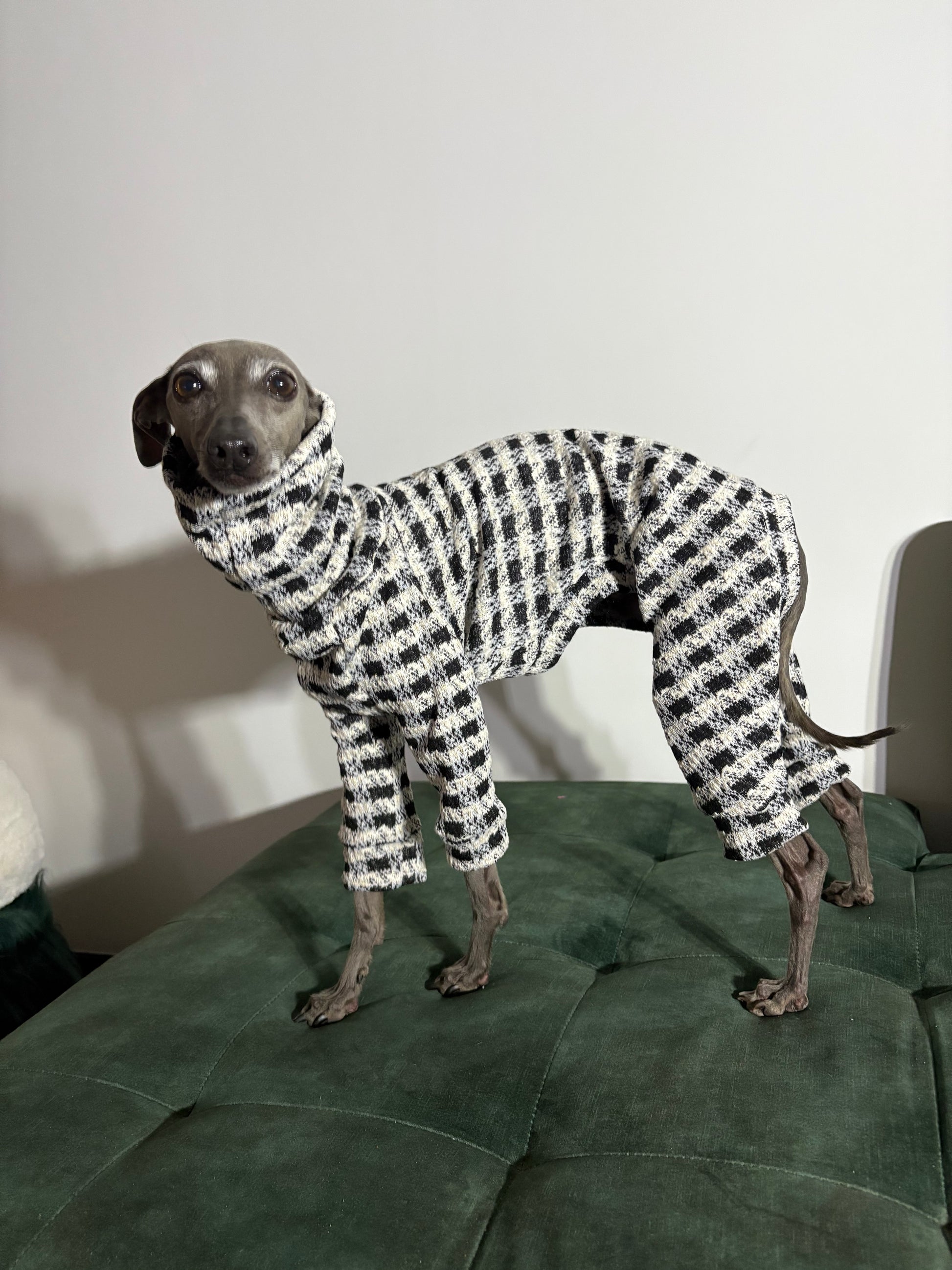 The perfect runway Iggy Suit for your fashion-forward dog. Chanel inspired chequered pattern with a subtle glisten of gold thread woven throughout.
