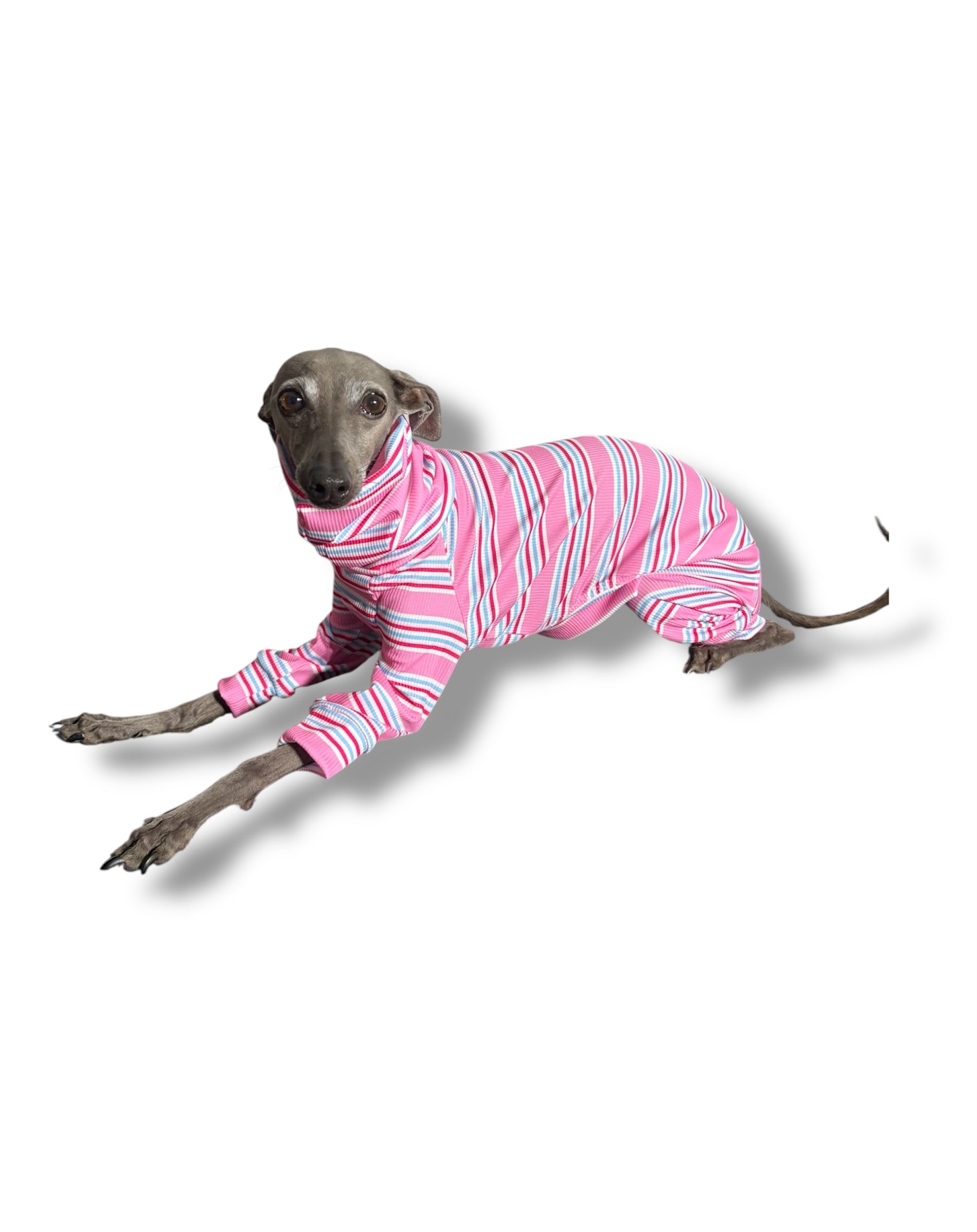 Our Iggy Suits London classic jersey rib suit in bright pink stripes.
