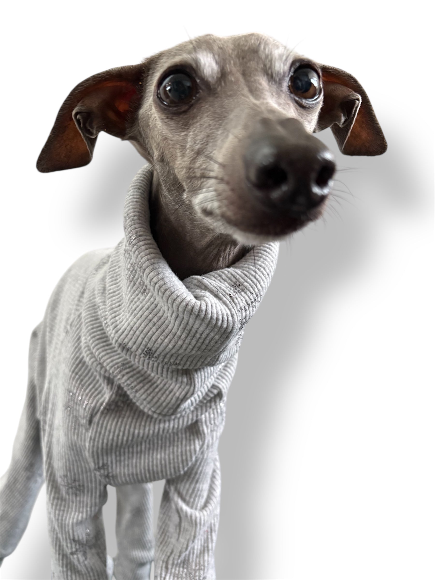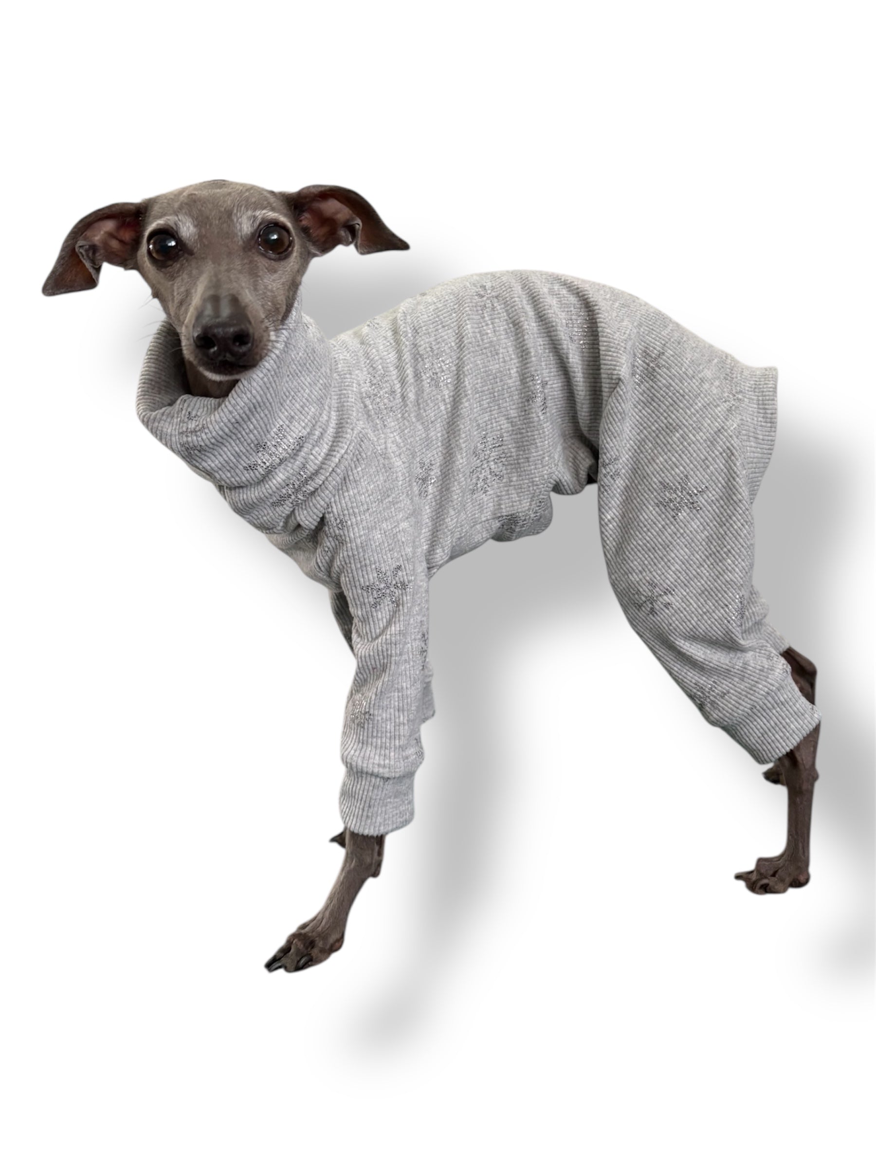 Our Iggy Suits London classic jersey rib suit with a wintery twist with subtle glittery snowflakes.